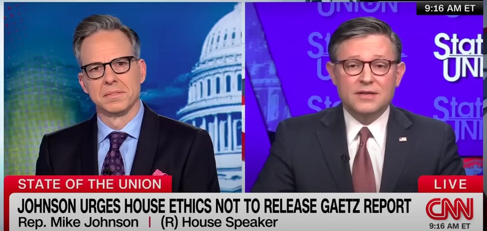 What a small man Johnson is. On Sunday he spoke to Jake Tapper on CNN’s “State of the Union” about the House Ethics Committee report on now-thankfully-former Rep. Matt Gaetz, which was set to be possibly released on Friday. But Gaetz, in a transparent effort to escape whatever embarrassing details are in the report, resigned from Congress on Wednesday. He also got himself nominated to be attorney general in Donald Trump’s next administration, thereby turning the question of releasing the report into a test of Republican loyalty to Trump.