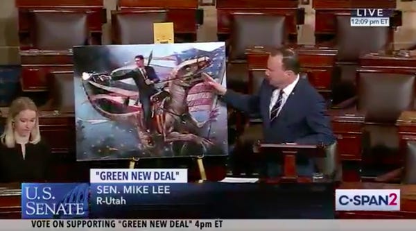 Senator Mike Lee (R-UT) is on the Senate floor right now discussing @AOC and @SenMarkey's Green New Deal. These a… https: //t.co/cI5la4eAM8