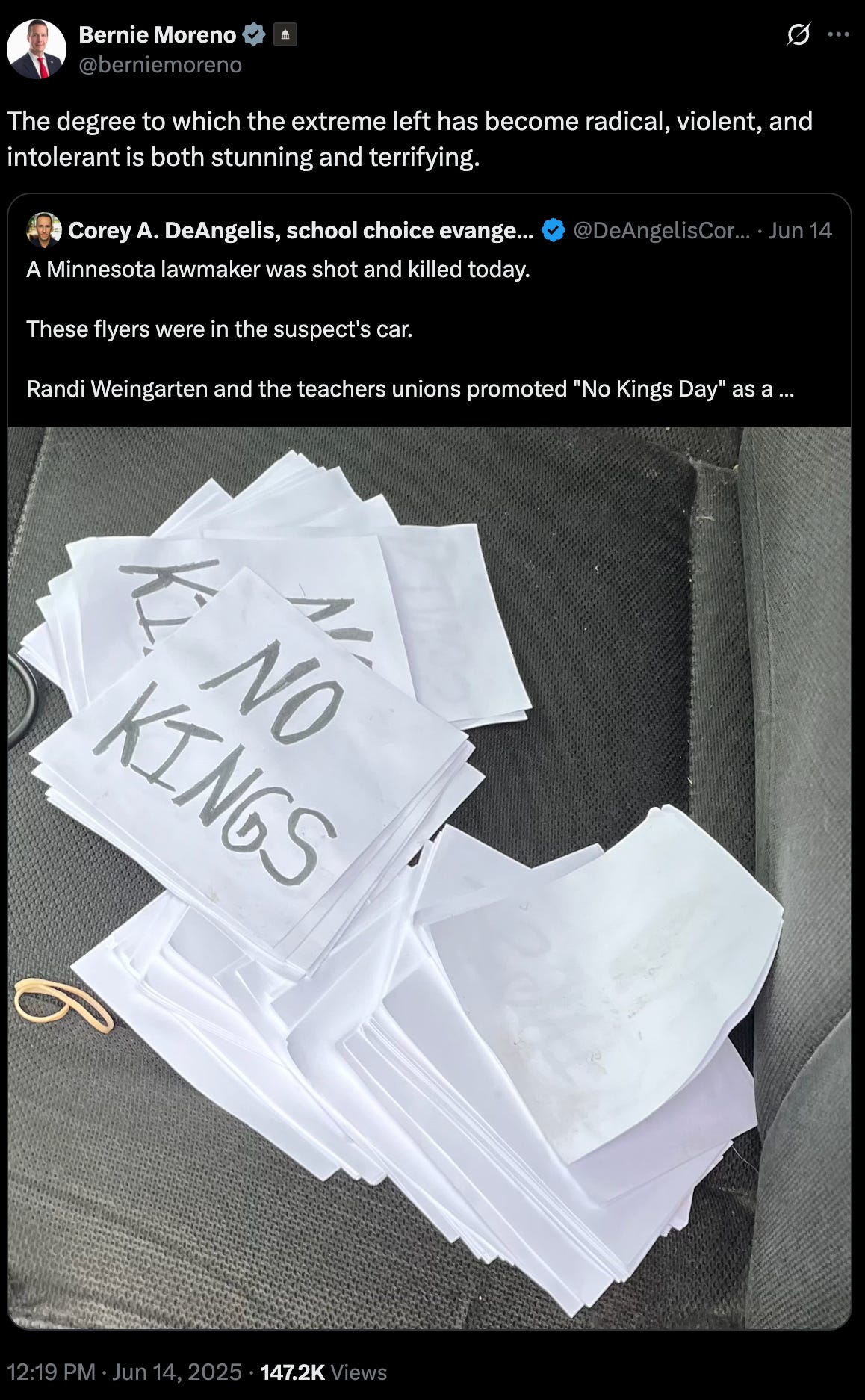 Mike Lee also had another tweet about it that said “Nightmare on Walz Street.” Ohio Republican Senator Bernie Moreno — another Republican dude with a lot in common with Vance Boelter — tweeted this, a retweet of another right-wing liar connecting “No Kings” fliers found in Boelter’s car with Randi Weingarten and teachers unions somehow.