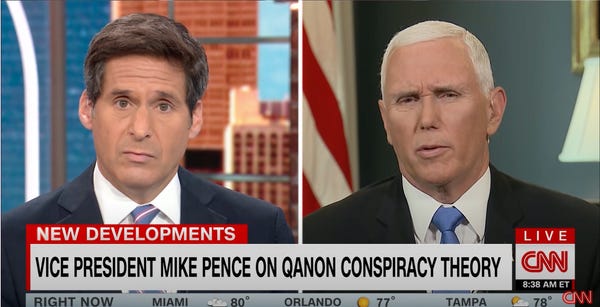 Eventually, Dokoupil successfully pushed Pence to say that he dismissed the theory "out of hand." He did not, however, explicitly say "this is not real and this is not happening," and until both he and Trump say that, it will only add fuel to the fire. Pence also denied that his refusal to address the conspiracy was adding fuel to the fire.