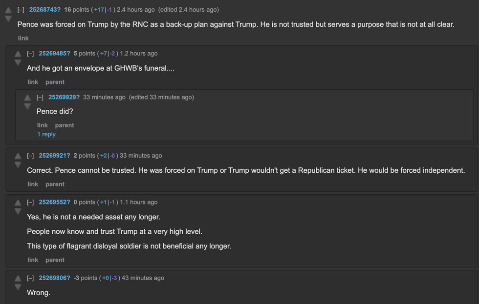 Perhaps you are wondering right now if this is the kind of thing that would affect belief in QAnon. It is not. Pence is "not trusted" by QAnon people who believe he was "forced" on Trump by the RNC "as a back-up plan against Trump." This was the popular take on a thread about the CNN interview on the Voat "Q Research" forum.