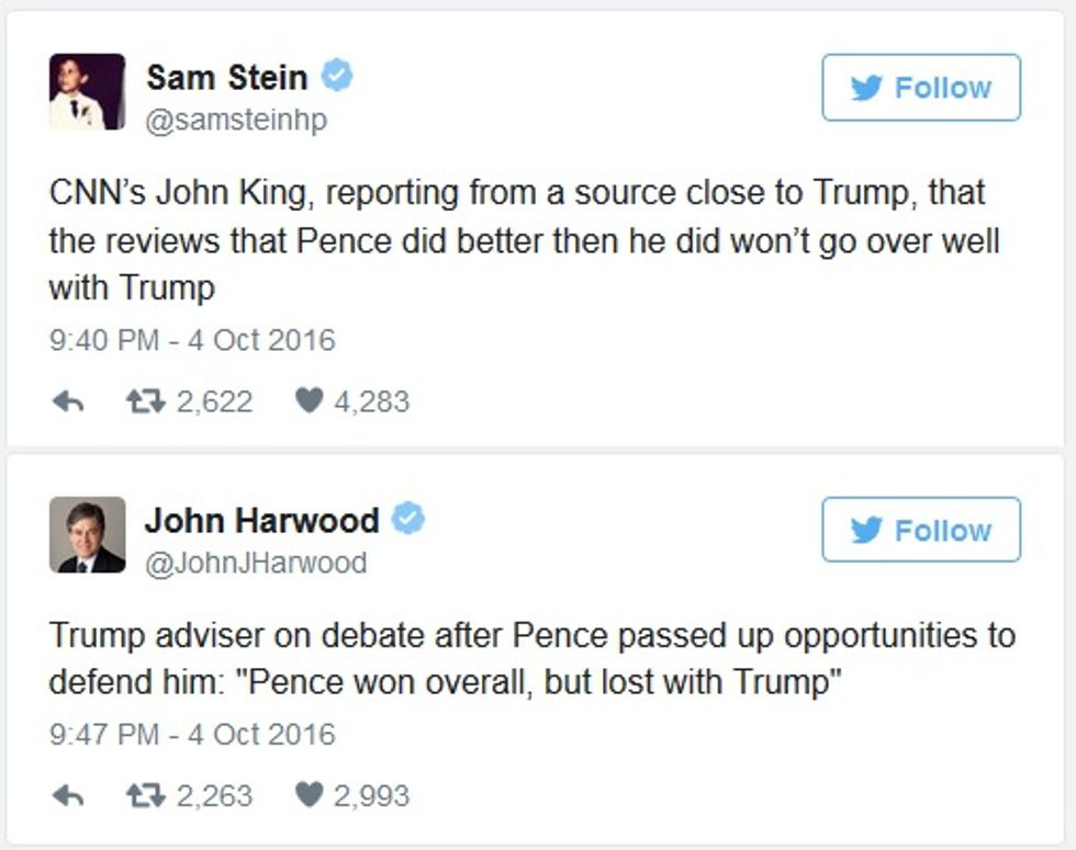 </center> <p/><blockquote>Well it's an interesting conservation going on in the conservative media -- a lot of them not fans of Donald Trump -- saying that a win for Pence, which they think this was, is not necessarily a win for Trump in the sense that it shows how Pence was a better debater than the man at the top of the ticket. [...] I want to give you one insight from somebody inside Trump world, who is in the inner circle in Trump world, who said that he does not think this is going to go down terribly well with the Donald Trump. Even though the Trump campaign is brushing up statements with all conservatives across the country praising Mike Pence. They said Donald Trump is watching the reviews and he's hearing Mike Pence won, but he didn't defend Donald Trump, and that Hillary Clinton and Mike Pence are better debaters than Donald Trump. Some people think that might not sit well with the boss.</blockquote> <p>And then there was this little <a href="https: //twitter.com/mattmfm/status/783522531793862656" target="_blank">instant poll result</a> that may give Trump a bit of agita, too: </p><p><a href="https://wonkette.substack.com/p/mike-pence-did-pretty-good-in-debate-will-donald-trump-punch-him-right-in-the-face/cnn-veep-debate-poll" rel="attachment wp-att-607258"><img id="3a100" data-rm-shortcode-id="606fae2e0d38412cb2c512ec6738b15a" data-rm-shortcode-name="rebelmouse-image" class="rm-shortcode " loading="lazy" src="https://assets.rebelmouse.io/eyJhbGciOiJIUzI1NiIsInR5cCI6IkpXVCJ9.eyJpbWFnZSI6Imh0dHBzOi8vYXNzZXRzLnJibC5tcy8xNzY3MjA5Ni9vcmlnaW4uanBnIiwiZXhwaXJlc19hdCI6MTcxMjEzMzAwNn0.ru8bIsz7z8_HoExlaUWjQ9w4Ptsk9PbBSPhrF5L3XWE/img.jpg?width=980" /></a> </p><p>Now, of course, Donald Trump is <a href="https://twitter.com/realDonaldTrump/status/783495937708527616" target="_blank">officially delighted</a> with Pence's performance, even to the point that he's <a href="https://twitter.com/realDonaldTrump/status/783660227530862592" target="_blank">disgusted</a> with that terrible Tim Kaine for interrupting Mike Pence so much while he was winning: </p><p><a href="https://wonkette.substack.com/p/mike-pence-did-pretty-good-in-debate-will-donald-trump-punch-him-right-in-the-face/trump-pence-debate-tweet" rel="attachment wp-att-607256"><img id="29f17" data-rm-shortcode-id="044ccb899ca247ee71257adf4867a51f" data-rm-shortcode-name="rebelmouse-image" class="rm-shortcode " loading="lazy" src="https://assets.rebelmouse.io/eyJhbGciOiJIUzI1NiIsInR5cCI6IkpXVCJ9.eyJpbWFnZSI6Imh0dHBzOi8vYXNzZXRzLnJibC5tcy8xNzY3MjA5Ny9vcmlnaW4uanBnIiwiZXhwaXJlc19hdCI6MTczNDY2ODI1N30.KLFy3-OPPwcdIHLMwh-B4CGZuKPpOFcdEvfOvlG-Xx4/img.jpg?width=980" /></a> </p><p>Yes, that makes all sorts of sense (WRONG!). </p><p><a href="https://wonkette.substack.com/p/lets-all-point-and-laugh-at-the-stupid-ugly-trump-pence-logo/trump-pence-logo" rel="attachment wp-att-604165"><img id="c1b09" data-rm-shortcode-id="4caa2c0027112f33635e4eaa13170cae" data-rm-shortcode-name="rebelmouse-image" class="rm-shortcode " loading="lazy" src="https://assets.rebelmouse.io/eyJhbGciOiJIUzI1NiIsInR5cCI6IkpXVCJ9.eyJpbWFnZSI6Imh0dHBzOi8vYXNzZXRzLnJibC5tcy8xNzY3MjA5OC9vcmlnaW4uanBnIiwiZXhwaXJlc19hdCI6MTczOTgyMTIwMH0.otNe0J62jpHmlSdzBpaFnUDl3u6mM5kXf9hyHMjJFmg/img.jpg?width=980" /></a> </p><p>There's no way of knowing how Trump will really react -- sure, we know Trump loves to surround himself with suckups and lickspittles, and when <a href="http://talkingpointsmemo.com/livewire/trump-introduces-pence-vp-pick" target="_blank">Trump introduced his running mate,</a> he actually spent 20 minutes talking about other stuff before finally bringing Pence onstage, almost as an afterthought. There were the <a href="https://wonkette.substack.com/p/trump-was-trying-to-get-out-of-pence-pick-at-midnight-last-night-because-he-is-a-fickle-dick" target="_blank">rumors Trump wanted to boot Pence</a> at the last minute. Then there was that one-day <a href="https://wonkette.substack.com/p/lets-all-point-and-laugh-at-the-stupid-ugly-trump-pence-logo" target="_blank">logo </a>that suggested Pence was the definite bottom in the relationship. Even uberloudmouth Chris Christie was reduced to an <a href="https://wonkette.substack.com/p/chris-christie-denies-being-held-captive-in-donald-trumps-sex-dungeon-of-shame" target="_blank">uncomfortable background prop</a> for Trump. So he may indeed be really peeved that Pence's debate performance was praised more highly than his own. </p><p>Then again, Trump is adept at converting everything on the planet into proof that Trump is a genius, <a href="https://wonkette.substack.com/p/donald-trump-tries-to-be-humble-and-its-worse-than-you-thought" target="_blank">including terrorist attacks.</a> So if Mike Pence did well in a debate, that may simply mean that Donald Trump is a terrific debater himself, since why on earth would Trump ever choose anyone who wasn't absolutely the best? God knows we're not going to try to explore the toxic waste dump of Donald Trump's thought processes, if any. We'll know for sure in a day or so, depending on whether Mike Pence plummets from a window of Trump Tower in a tragic accident. </p><p>[<a href="http://www.vox.com/policy-and-politics/2016/10/5/13170838/pence-trump-unhappy" target="_blank">Vox </a>/ <a href="http://mediamatters.org/video/2016/10/05/cnn-reports-trump-insider-says-trump-may-be-unhappy-narrative-pence-superior-debater/213539" target="_blank">Media Matters</a>]</p>