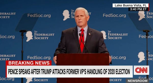 "President Trump is wrong. I had no right to overturn the election," former Vice President Mike Pence told the Federalist Society yesterday. "The presidency belongs to the American people, and the American people alone. And frankly, there’s no idea more un-American than the notion that any one person could choose the American president."