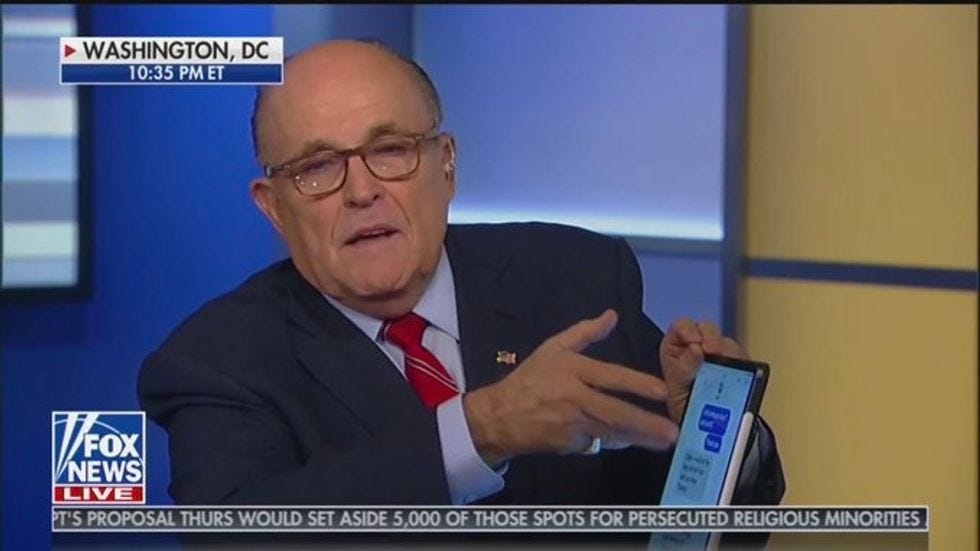 So if Pompeo was on the call -- which has now been confirmed by CNN and NBC -- the State Department's efforts to paint Rudy Giuliani as a rogue cowboy, wilding out in Ukraine trying to get them to frame Joe Biden, looks a whole lot less credible. Well, just Rudy and Fox news loons Joe DiGenova and Victoria Toensing, whom Fox News revealed are secretly colluding on the Ukraine thing with Giuliani while presenting themselves as impartial commentators on the air, because "only the president knows the details of their work." (Please, Lord, grant us one, single news cycle where we can write this kind of batshittery up as a stand-alone. PLEASE!)