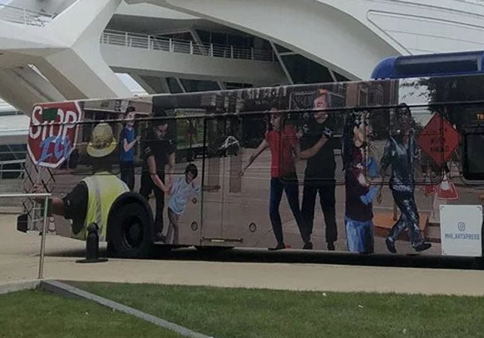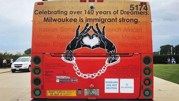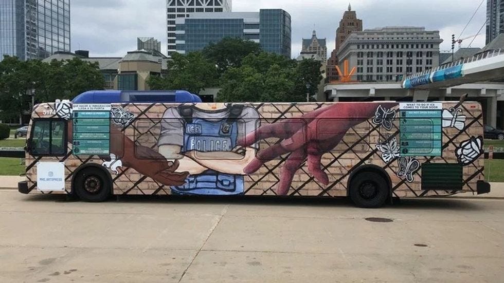A Milwaukee Art Museum program for artsy young folks puts art into motion every summer by letting the kids design a mural wrap applied to a bus, or sometimes to a bus shelter. This year, the kids decided to do some current events, and designed a wraparound mural depicting Immigration and Customs Enforcement (ICE) officers separating kids from their families, as well as a multi-ethnic we're (almost) all immigrants here message for the back of the bus.