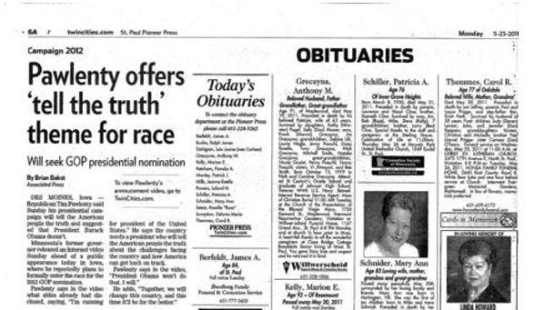 Minnesota Newspaper Puts Pawlenty's Campaign Announcement On Obituary Page