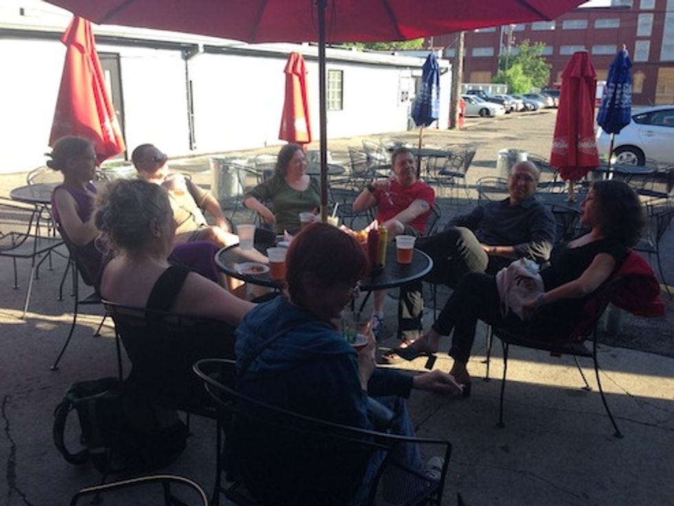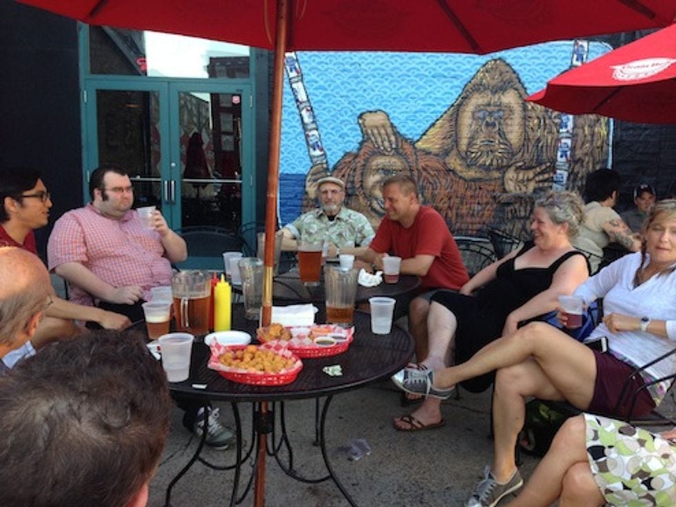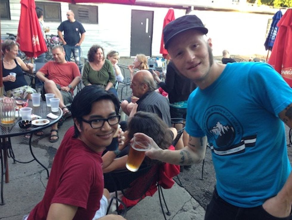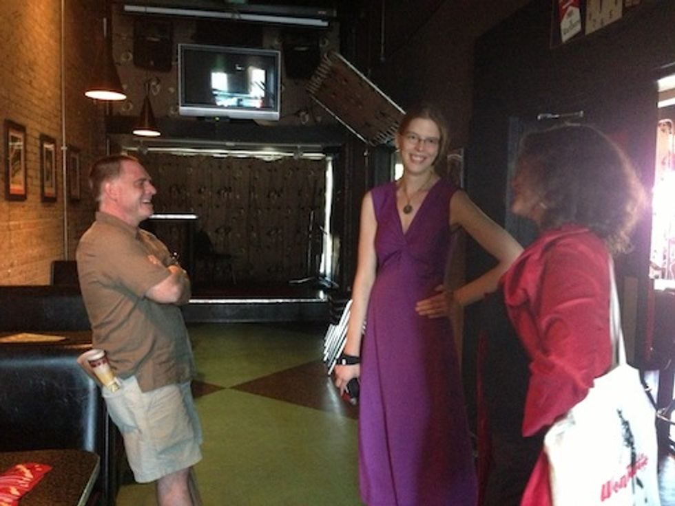So here are some pictures, of the People. Some were commenters! Some were not commenters! One guy got all mad that the T-shirts we were selling out of our trunk were not free, and wadded up a fiver and threw it at Miss Lisa Wines! It was cute. They came to Grumpy's to meet us. We bought them beer. We tried to make out with someone in one of these pictures, but, as sadly happened in each of our stops but one, EVERY TIME we tried to make out with someone, he was like, "nah mang, that's cool." Our therapist suggested we watch some gay Science Channel documentary on men and women and genes and whatnot. (How not to scare men off by saying "HEY DO YOU WANT TO MAKE OUT WITH ME" because then they are like "waaah, a whore," or something, we guess.) Whatever.