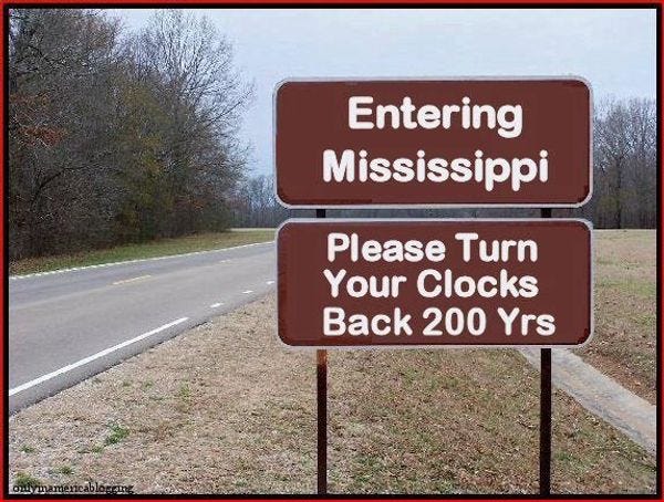 Mississippi came perilously close to entering the 20th Century last week (The 21st? Not even close!) as a conference committee considered a bill that would add domestic violence to the acceptable grounds for divorce in the state. In the end, Mississippi (which only ratified the end of slavery in 2013) decided it wasn't quite ready to take such a radical step, thanks to a last-minute amendment which would also have allowed people to divorce after two years of separation.