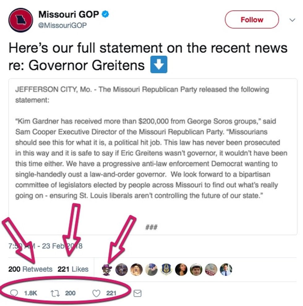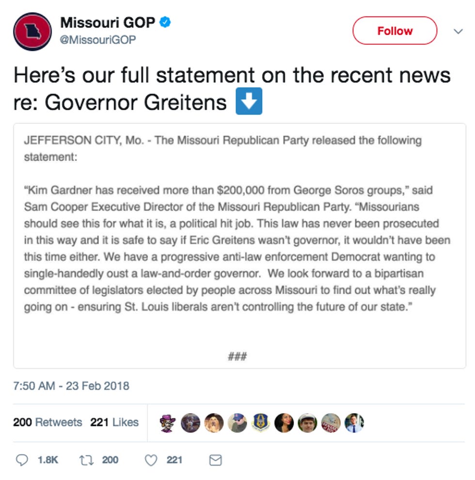 Is there something in the water in Missouri? Plenty of state-level Republicans are bonkers, but the Missouri GOP is next level, hide the steak knives, CRAYCRAY. Here's the statement the party issued yesterday after Republican Governor Eric Greitens was indicted for felony Invasion of Privacy.