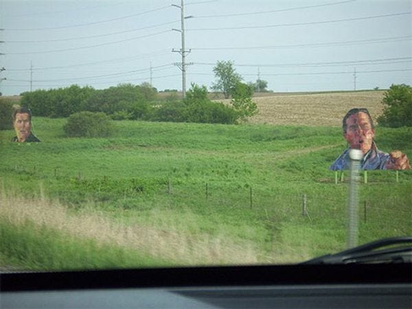 Wonkette operative "Laura S." was just cold drivin' through Iowa when she spotted these awful giant-human heads growing out of the fertile, head-growin' Iowa manure-soil. What is this about? Well, that's Mitt Romney on the left. He emerges from the Iowa dirt every four years, like Mormon Jeebus, to once again haunt the people of Iowa, who will (like every year) refuse to nominate him for anything.