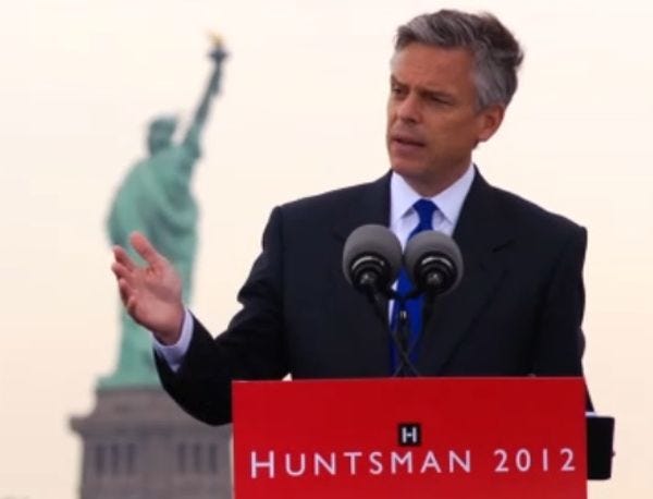 Jon Huntsman is in ! For what? Who is he? Is he Tim Pawlenty 2.0 campaign reboot? No, he is the Chinese guy running for president. He's not Chinese? He is Mormon. So he is Mitt Romney the Sequel? Huntsman formally declared his candidacy today in the liberal Mecca of New York City, because the socialist French statue is there, which makes a good GOP campaign announcement backdrop. Huntsman is Obama's former ambassador to China, a job reference he may want to leave off his resume when he hands it to the Republican voters. "Chinese ambassador" sounds an awful lot like "Kenyan Muslim" if you have no idea where China or Kenya are on a map, which is a lot of Americans.