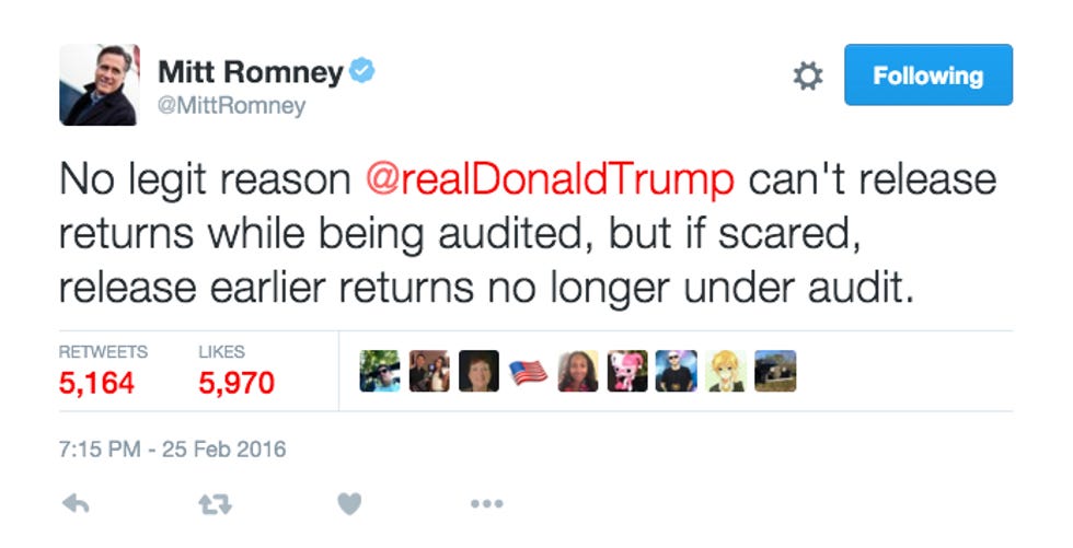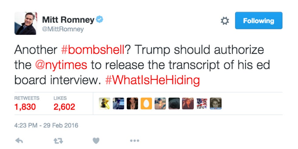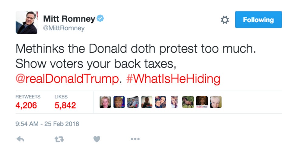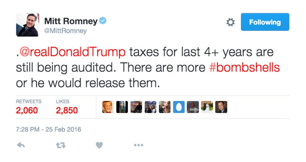 [contextly_sidebar id="NG6cLJEN9v6zoiWe4rTpJk3gWv3wVmqp"]And yet. AND YET. For a twice-failed candidate who has no plans whatsoever, no sir, to swoop in to the presidential race at the last possible moment -- perhaps at oh say a brokered convention ? -- to save the party from itself and one Mr. Donald J. Trump, Romney's hardware has been humming awful loud lately. Last week, he pulled a Harry Reid, demanding to see Trump's tax returns and the all-but-certain "bombshell" hidden in them. And he hasn't stopped flapping his Twitter gums since: