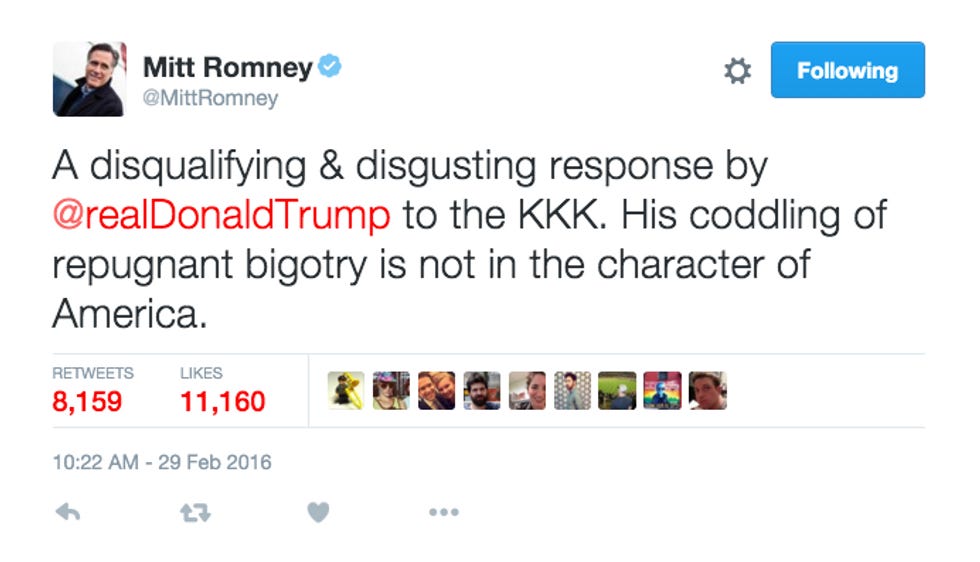 But since Romney has already declared Trump is disqualified from the Oval Office, and he has not endorsed any Not Trump candidates, we can only speculate. Maybe, just perhaps, if Trump's "competition" fails to stop him from stomping all o'er them on this, our super duper Super Tuesday, Romney will answer the call of The Establishment to serve his party once more, and have his buttocks served to him in November. Again.