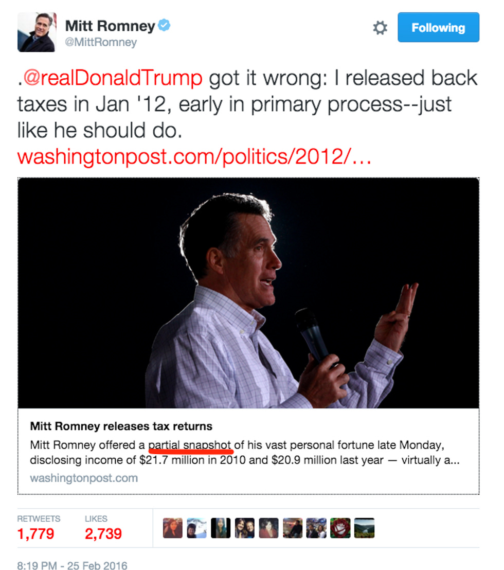 Let's pause for a moment to appreciate that even Romney's own tweet to prove he did TOO release his tax returns in the 2012 election says, right there in plain regular American English words, that he merely released a "partial snapshot." Christ, Mitt's not even in this race (yet), and he's still sucking at it. Good ol' reliable failtastic Mitt.