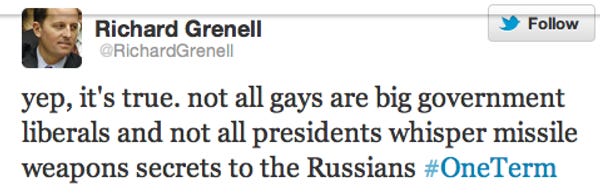 This is in contrast to Mitt Romney, who has bravely defended gay marriage. That is probably why Grenell is working for him!