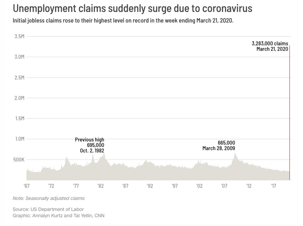 The new unemployment numbers are out, and they'll knock the wind right out of you. THREE POINT THREE MILLION. That's the number of Americans who applied for unemployment last week. Here, have a graphic from CNN .