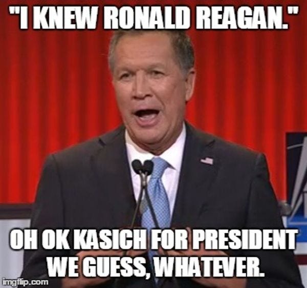 [contextly_sidebar id="YyRIgC8CHFch2ikeYAtnArK2EtdQ3vfQ"]During Thursday night's Republican debate, John Kasich wanted us to know something very, very important: "I knew Ronald Reagan." SOLD! He also wanted us to know that he was the only "adult" on the stage, the only one capable of making brain thoughts between his ears.