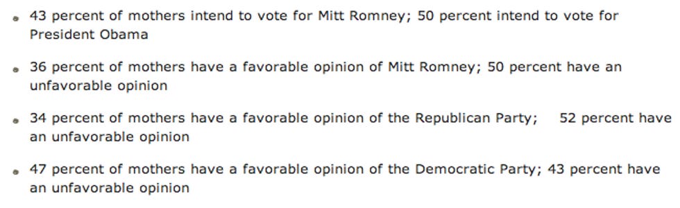 That is especially too bad for GOP nominee Mitt Romney because usually at least the mom sector of ladies edges Republican, sitting there in their minivans and understanding the economy because they take their kids to school and practice, and doing other mom stuff (anal?) while their slutty little sisters the swingles vote hot-and-horny D. Here, have another screenshot!