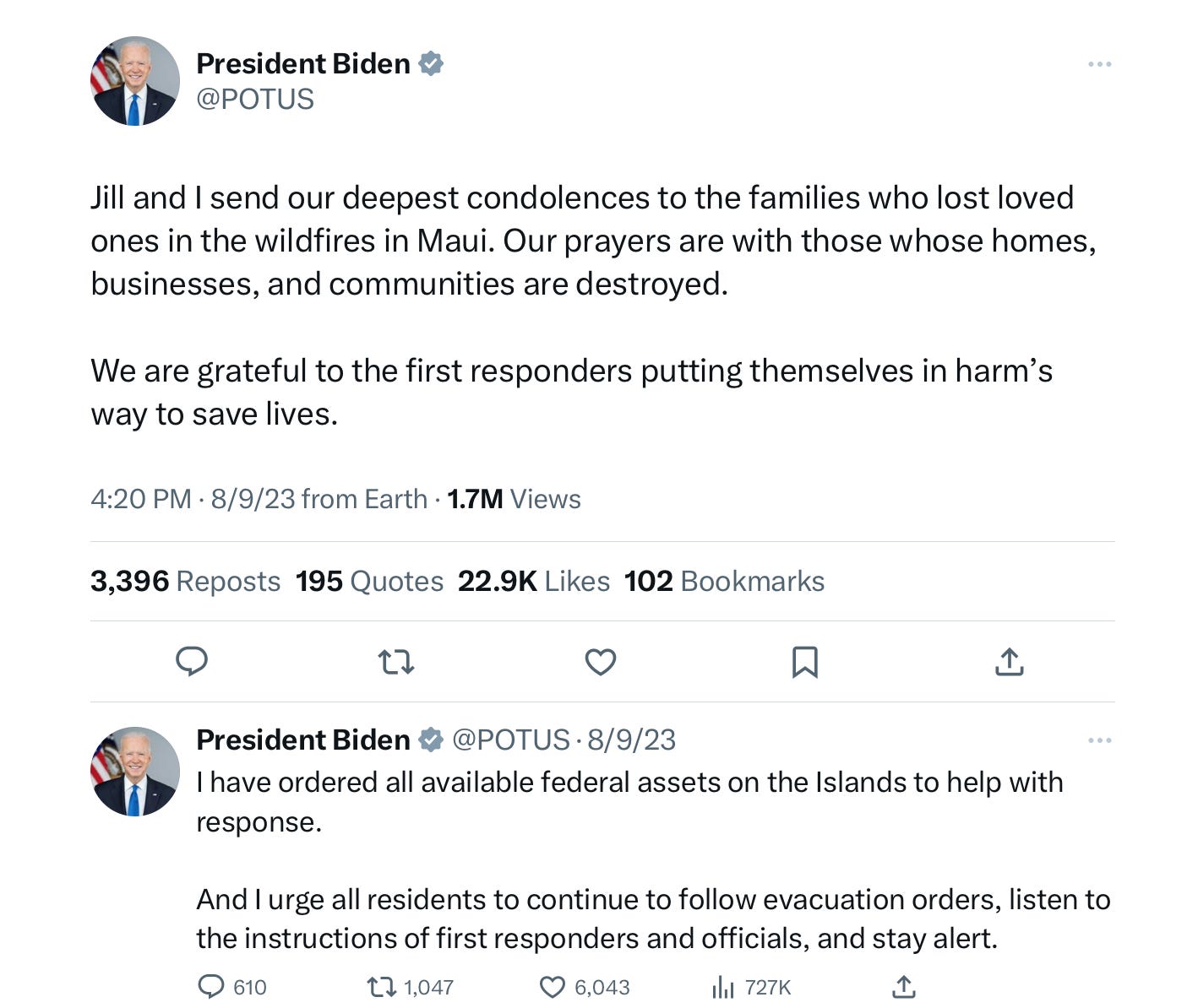 On August 9, Biden posted his “deepest condolences” on Elon Musk’s perpetual vanity machine. He clearly stated that he’d “ordered all available assets on the Island to help with response.”