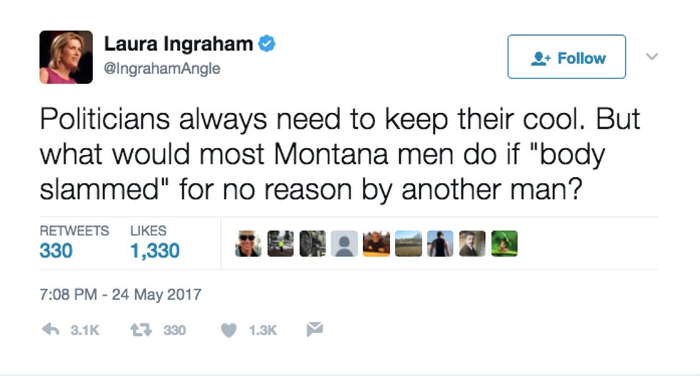 Last night, we heard what Greg Gianforte -- the billionaire Republican nominee for today's election for Montana's sole House seat -- does when there are witnesses present. (We're not saying, but we're just saying: Has anyone checked on his wife?) According to Guardian reporter Ben Jacobs, who you can hear was clearly in shock, Gianforte "bodyslammed" Jacobs when he asked whether yesterday's late-breaking CBO score would give Gianforte pause in supporting the Republicans' American Health Care Act (AHCA). A Fox News crew that was present -- also in shock -- wrote afterward that they all watched as Gianforte did slightly more than that: According to them, he grabbed Jacobs by the neck and threw him to the ground, and then started punching him.