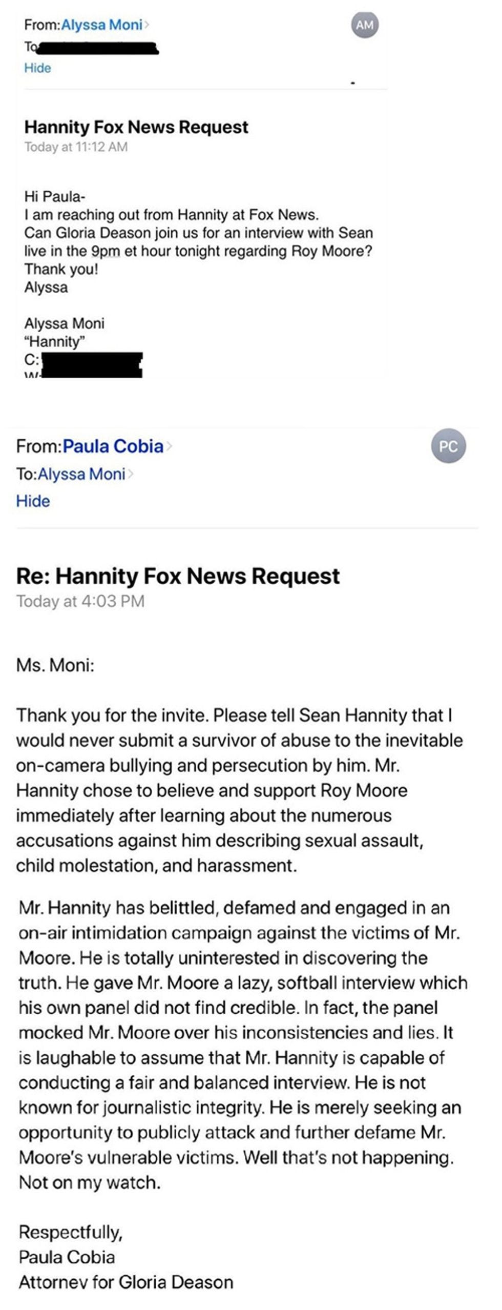 Here's the email exchange between Hannity's booker, Alyssa Moni, and Deason's attorney, Paula Cobia (we've formatted it to fit better in a single column):