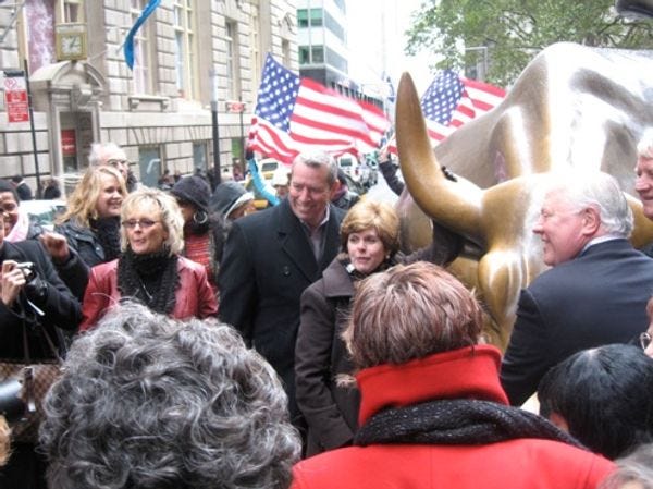 Wonkette operative hero "Dan the Man" sent us a powerful/artistic photo yesterday of a bunch of Christian nuts praying over a false bronze idol, the Wall Street Bull (or Bowling Green Bull for you dandies out there), asking God to nationalize the economy under the state of heaven so that they could pay for their porn subscriptions and fried NASCAR-themed dildos for a few more months. Well, "Dan" has come through again and sent us a video and a few more hilarious photos, such as the one above featuring, whoa, is that the Regina of Phoenician-Based Symbols Created To Represent Sounds, Madam Peggy Noonan of the Wall Street Journalshire ? Scandal!