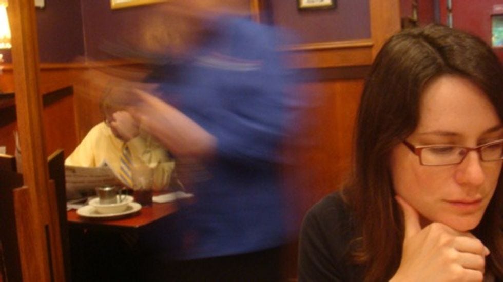 Here's Sara at Richmond's "greasy spoon diner," Purley's, with ghosts! All of the food down here is made of gravy and cheese grease, and chicken, and Brownies.