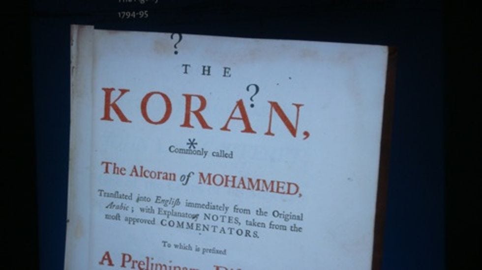 They didn't have the "real" Thomas Jefferson Muslin Bible there, but there was this thing with raining question marks on the teevee screen. "Alcoran," the snob called it.