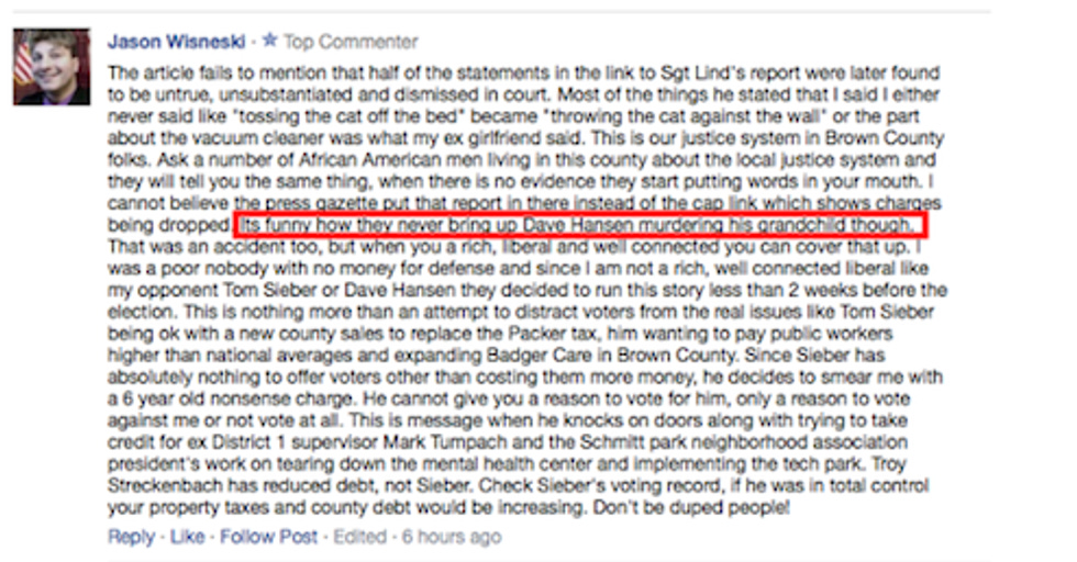“It’s funny how they never bring up [Democratic state senator] Dave Hansen murdering his grandchild though,” Wisneski wrote in his post, which was later removed.