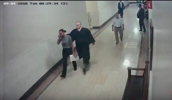 There is some good news here: Bachman resigned on September 10 after video was released of him bum rushing Jackson. He claims he only did so to spare the court embarrassment but he would've "defended" himself if he knew the story of a guy manhandling a woman and throwing her in jail for felony noise would go "public." He thinks it's regrettable that the video lacked "audio" so we could hear Jackson's "loud and persistent yelling." This guy should really just invest in some noise-cancelling headphones. He could also probably happily open a useless but expensive trinket shop in a tourist destination. Those are always as quiet as a morgue. He could even repurpose the laminated sign that used to hang in his office. It read (in all-caps, of course): "Remove hat. Tuck in shirt. No talking."
