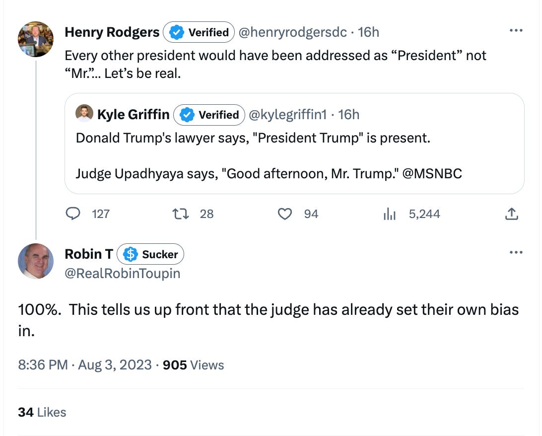 Now, it doesn’t actually matter whether or not Judge Upadhyaya has any “bias” against Trump, as she’s only overseeing his arraignment, not the actual trial — but was this a pointed insult? Should she have referred to him as president and was this something a normal judge would do for a former president he or she did respect?
