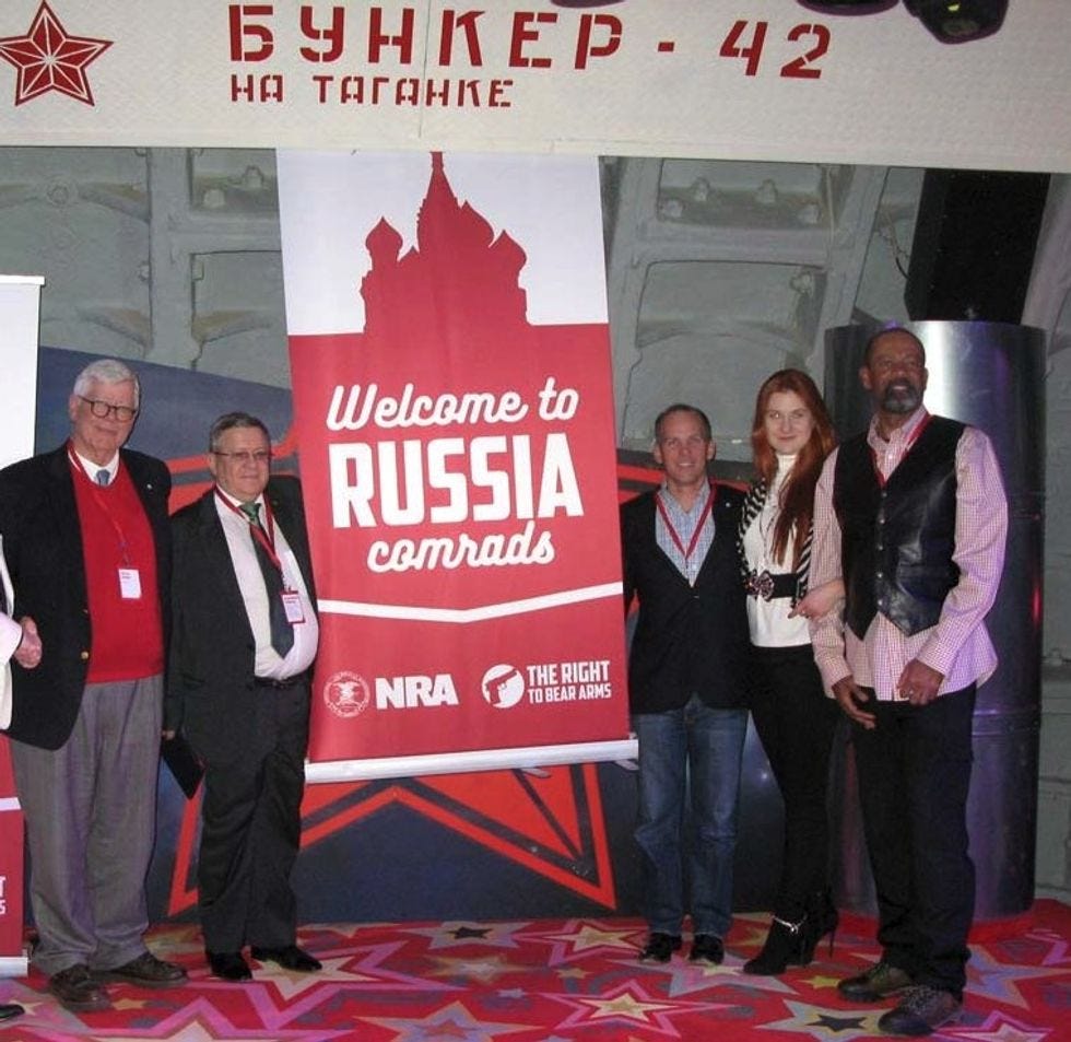 Then Erickson helped Butina prep for a field trip to Moscow with a bunch of NRA bigwigs by providing "his assessment on their degree of political influence in the United States." Check out Sheriff Bling Clarke in the leather vest and pink checked shirt, SO METAL.