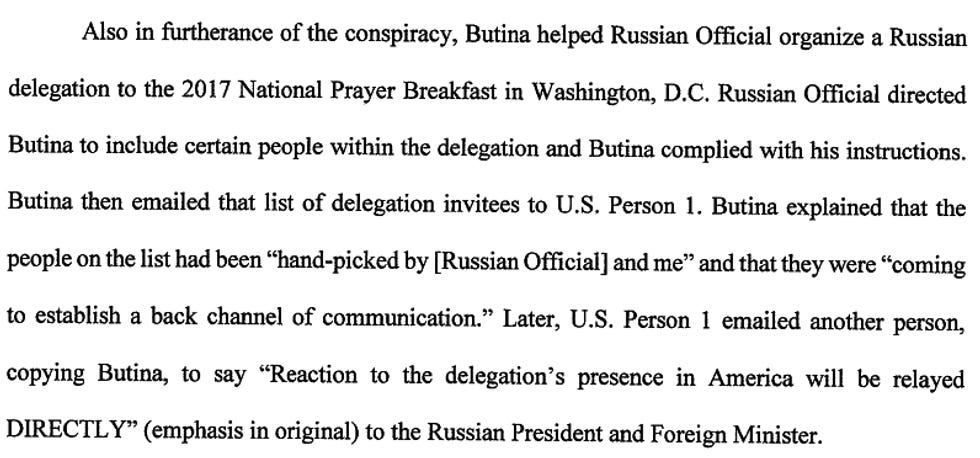 Butina also told prosecutors all about that fun time when she organized an outing for Russians to schmooze at the National Prayer Breakfast in 2017, "to establish a back channel of communication" to the hacks in Trumpland. Once you get those evangelicals eating out of your hand, the GOP will greenlight anything. Just ask Israel!
