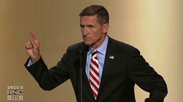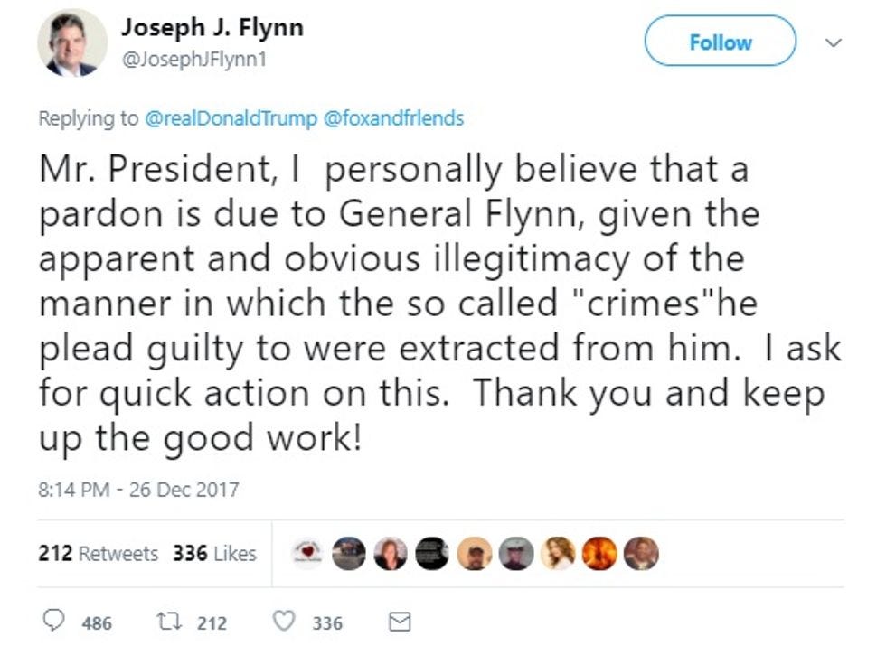 Apparently Joe Flynn thought that phrase "the illegitimacy of his confessed crime" was a tad ambiguous and left the impression that his brother might have done something "wrong," which is of course impossible since Mike Flynn is a great patriot. He later submitted another reply, possibly after someone pointed out the first one sounded a tad deranged, and that Trump might not appreciate the bitter implication that trump hadn't done enough for the general so far: