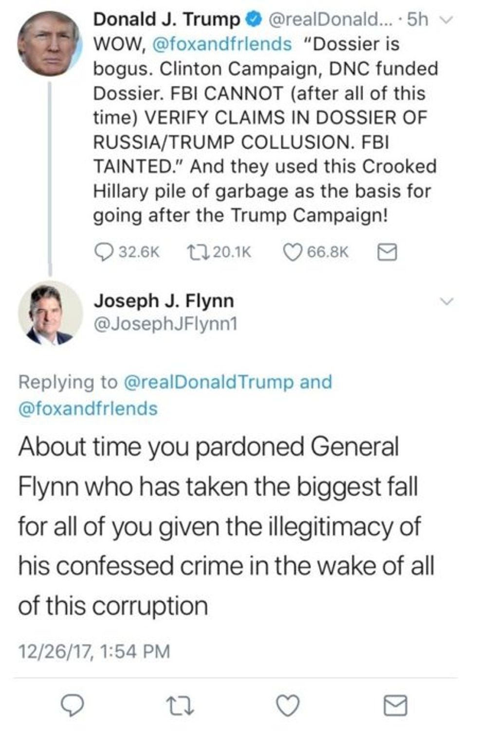 At least some people still believe in Michael Flynn, who pleaded guilty to lying to the FBI in a deal to cooperate with special prosecutor Robert Mueller. Flynn's brother Joseph is on the case! After Trump tweeted about a Fox & Friends story yesterday, proclaiming the Dossier a great big fakey-fake, Joseph Flynn posted his own impassioned but incoherent call for justice, which stayed up for about 15 minutes -- just long enough for Newsweek to grab screenshots (we've combined their two images into one, full disclosure):