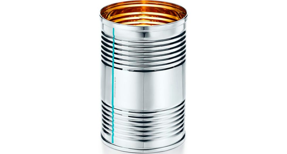 Next up, we've got this tin can. It is from Tiffany's. It costs $1000 and does not come with peas or even some gold-plated soup. You have to put your own soup in it, I guess.