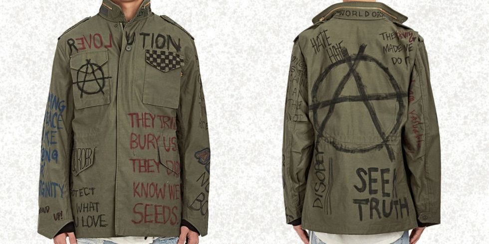 The irony of this jacket, though, isn't just in the fact that it is a very fancy copy of a style it is very cheap to make. It's also that the very point of such a jacket is supposed to be an "F-U" to consumer culture and capitalism.