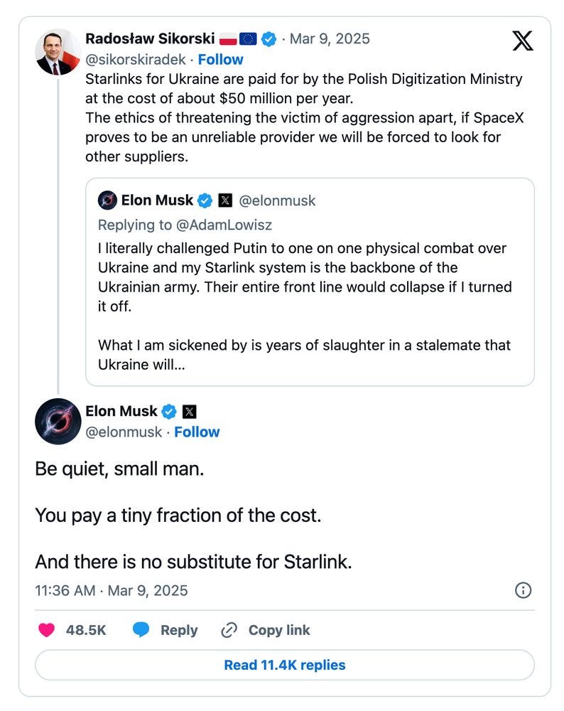 Musk’s foreign policy instincts in general totally suck. As Marcie wrote about on Monday, here he is sneering and name-calling Poland’s Minister of Foreign Affairs over the weekend after Radioslaw Sikorski called his threats to turn off Starlink unethical, and threatened to find a more reliable provider for the service:
