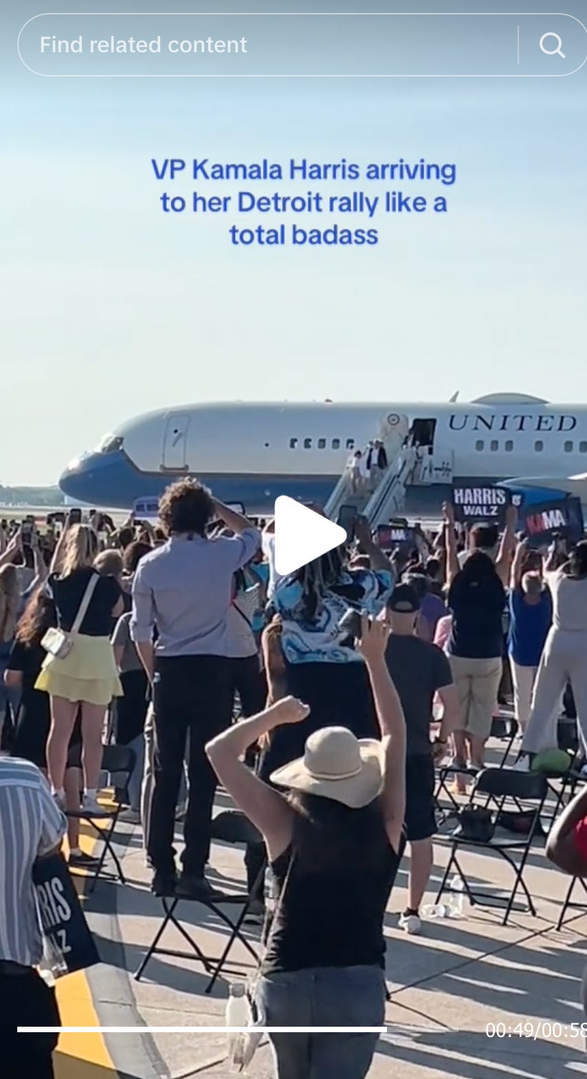 Trump is losing his mind saying Kamala’s Detroit rally was AI, so I was looking for videos of Air Force Two arriving. Which is how I just found my ass in someone else’s TikTok!