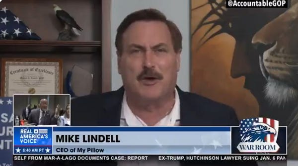 Mike Lindell, the man with the pillows and the voting machine secrets, was on the Steve Bannon show yesterday, and he had a bit of a meltdown.