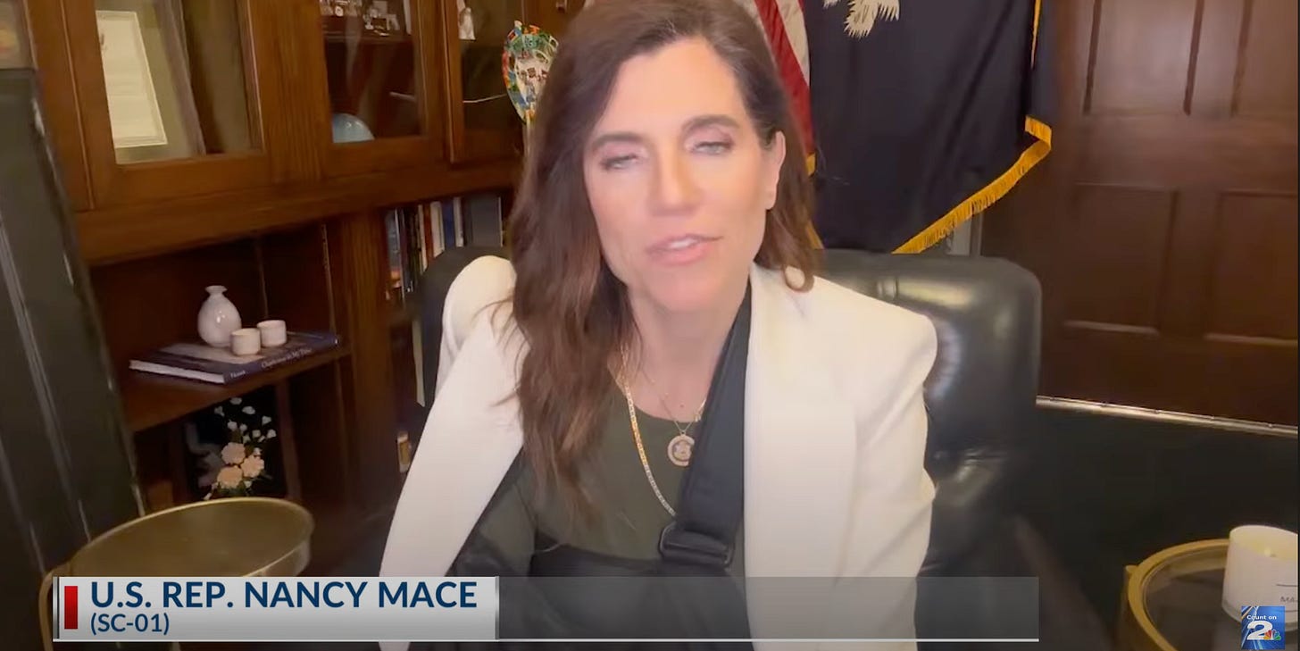 In summary and in conclusion, the real reason Nancy Mace is mad right now is that none of her stunts are working and everybody thinks she’s a clownfucking joke and nobody likes her, not even the people she desperately wants to be her friends.