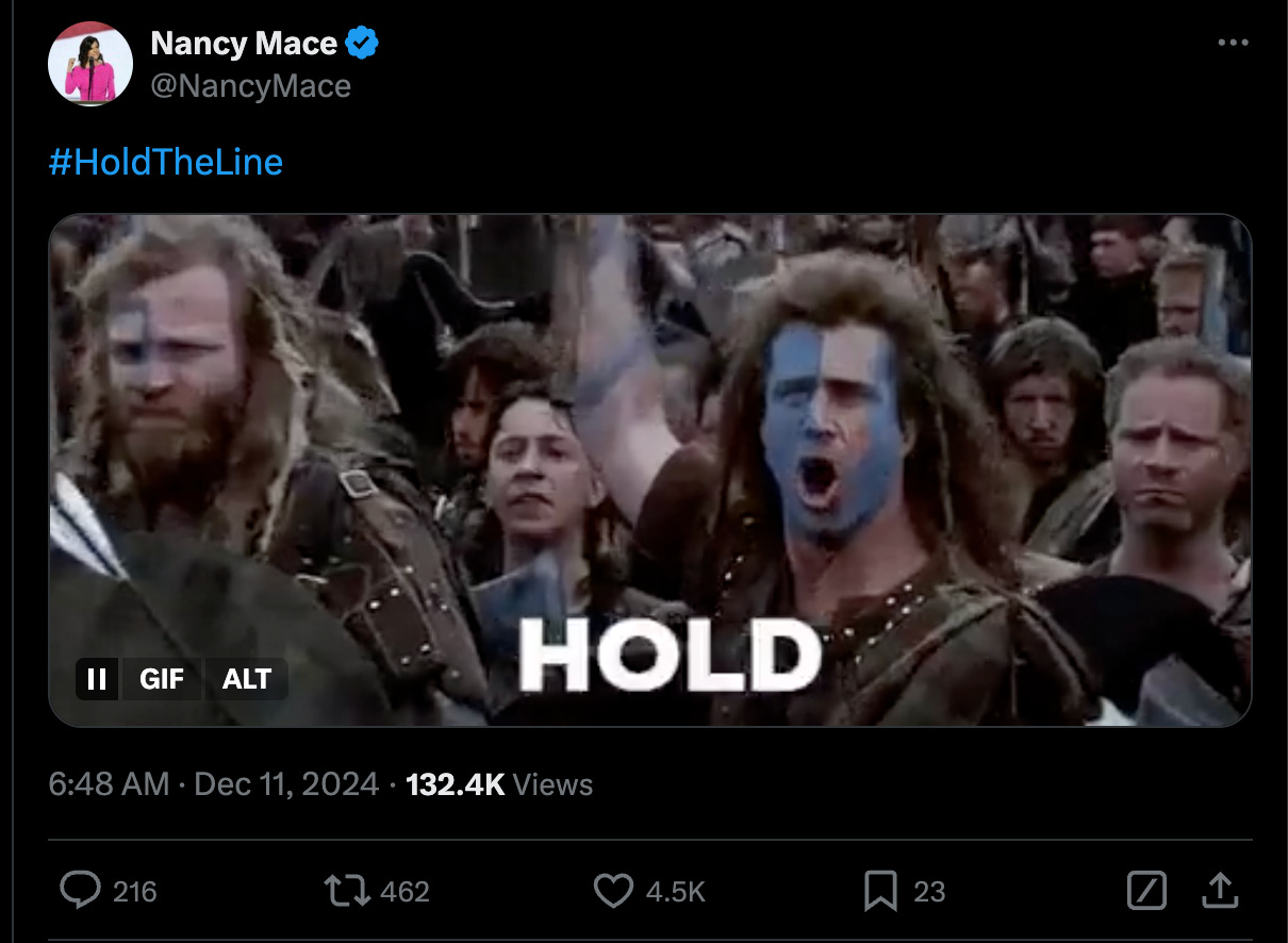 Ever since the incident, Mace has been tweeting about it, and about trans people, with approximately the frequency of Donald Trump were he to become inadvertently super-glued to his toilet. Every tweet, just about, has the hashtag #HoldTheLine, because did you know MAGA conservatives have this hilariously weird PornHub fantasy about being Braveheart? They do, and it is so goddamned funny and so goddamned weird. It’s mostly the MAGA men, but we guess the MAGA women are into it too.
