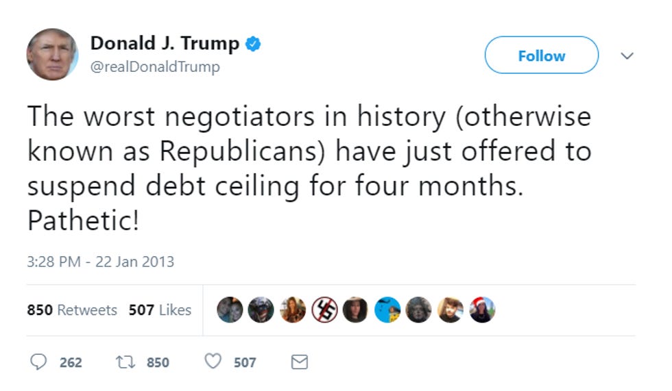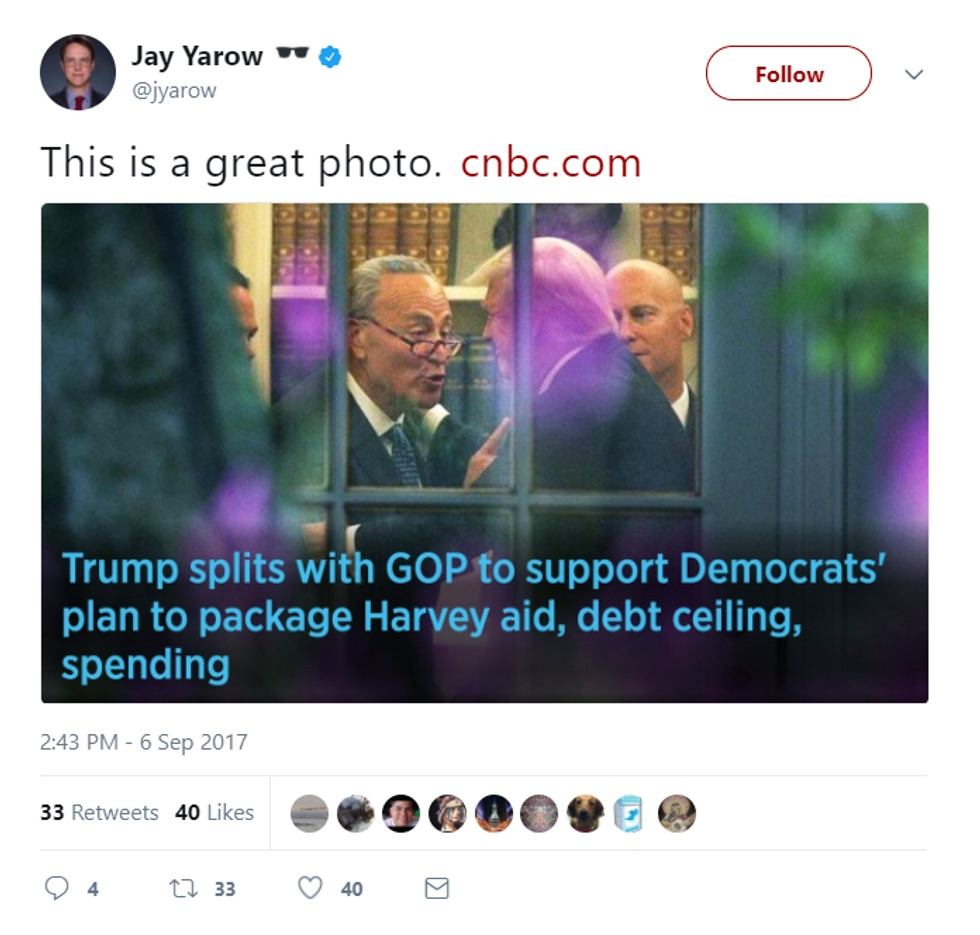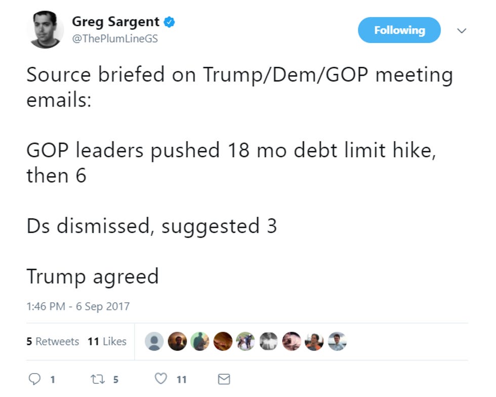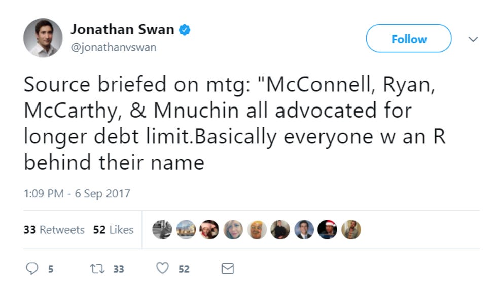 "We had a very good meeting with Nancy Pelosi and Chuck Schumer [ Trump notably did not mention Ryan or McConnell ]. We agreed to a three-month extension on debt ceiling, which they consider to be sacred, very important, always we'll agree on debt ceiling automatically because of the importance of it. Also on the CRs and also on Harvey, which now we're going to be adding something because of what's going on in Florida, but we had a very good meeting. We essentially came to a deal, and I think the deal will be very good."
