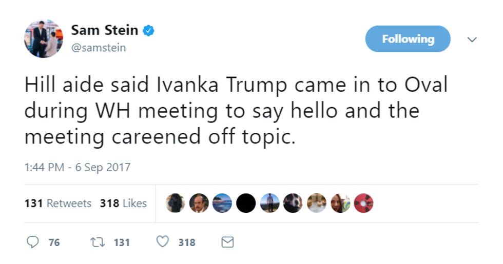 But back to Nancy Pelosi and Chuck Schumer showing Trump how REAL leaders grab puss and take it to Haverty's, Jonathan Swan at Axios spoke to a "Republican close to leadership" and learned there's even hope for DACA coming out of this meeting: