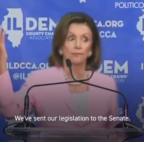 So, besides protecting Russia's sacred role in making sure white supremacist Republicans have an outsized role in our electoral politics, what other kinds of bills was Pelosi talking about, that Moscow Mitch is burying in the backyard like a common turtle-shaped dachshund the Grim Reaper found at a shelter for yappy hellhounds who've been abandoned by their original demon owners because they are very bad dogs? Oh nothing, just for instance: