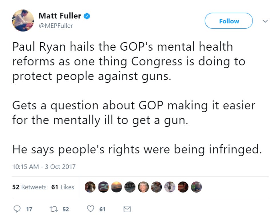 Will Ryan listen? LOL ARE YOU NEW HERE? Today, Ryan's House of Representatives is voting (again) on a 20-week abortion ban, because that's pressing . We guess that's why they were all too busy (pussy) to go on "Morning Joe" and talk about Las Vegas today. No really! Mika Brzezinski said Tuesday morning after interviewing yet another Democratic lawmaker that they had invited a number of Republicans, but everybody was too busy (pussy) to show up.