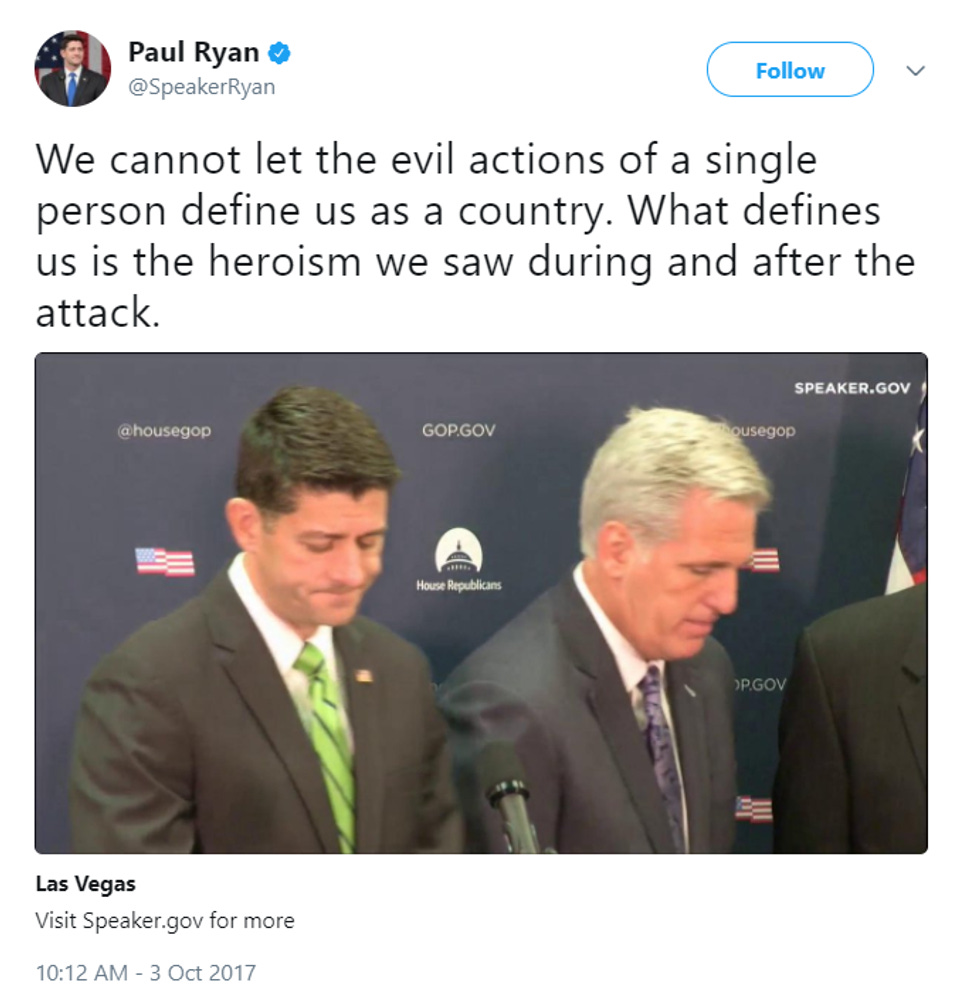Meanwhile, Ryan is blah-blahing empty-headed pretty boy platitudes about "our shock, our condolences, & our prayers," and tweeting things like this: