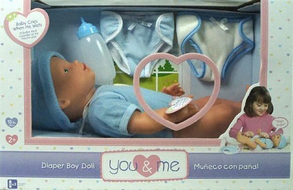 Apparently the fuss is at least partly over the lack of any indication on the box or the manufacturer's website that the drink-n-wet boy doll (which also cries when he wets, which would make it the perfect companion for a kid to bring on an airplane) has a teensy plastic willy: