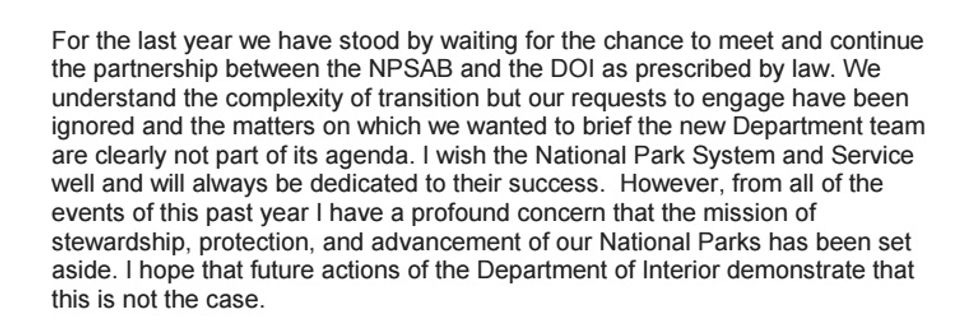 Knowles's letter also noted that the board had looked forward to briefing Zinke on some of the matters it had provided previous Parks Service directors and Interior secretaries, like