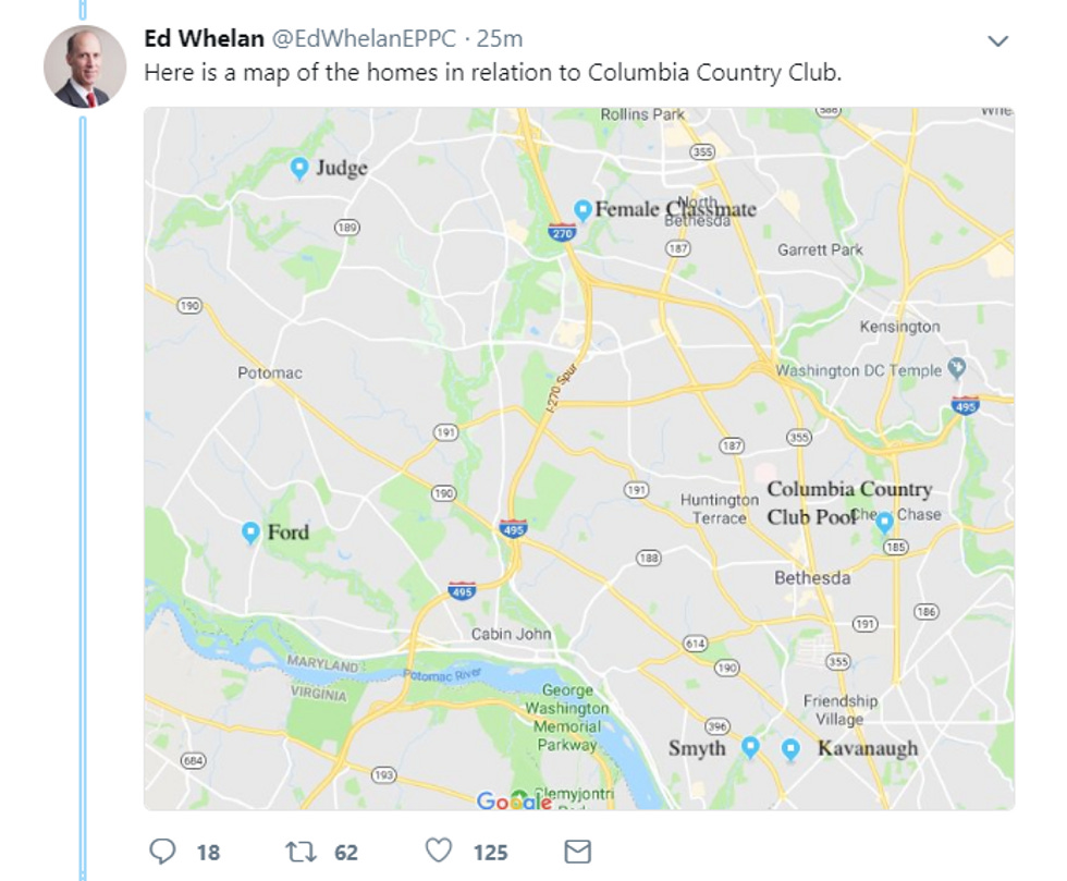 As evidence, he used facts, reason, science, Zillow, Brett Kavanaugh's high school yearbook, and Google Maps, which solved ALL OF IT. First of all, Whelan says Brett Kavanaugh is not the real rapist because he just lived too far away. (They did not have cars when Brett Kavanaugh was in high school, apparently.) Ed Whelan found another guy who went to high school with Brett Kavanaugh, guy whom he named by name, and we're not gonna, guy who's a middle school teacher now and who looked kiiiiiiiinda like Brett Kavanaugh in high school -- not really hardly at all, but we guess they share a certain entitled white boy joie de douche -- and his house was right near the Columbia Country Club. UH OH! Christine Blasey Ford said the incident happened near Columbia Country Club! Therefore QED MUH-FUCKERS, Not Brett did the raping, not that Ed Whelan is accusing Not Brett of being a rapist, perish the thought and bless his heart !